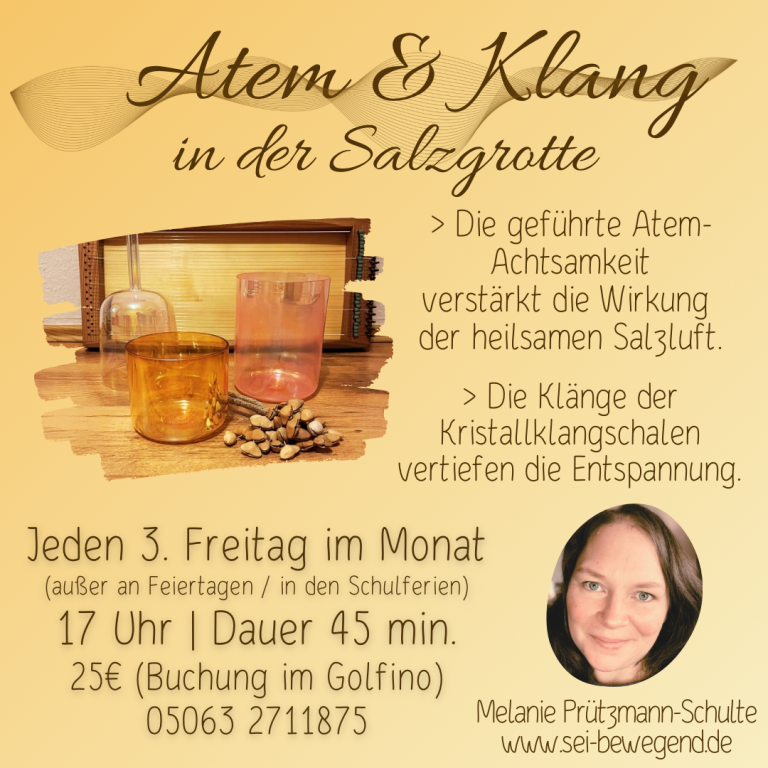 Jeden 3. Freitag im Monat findet in der Salzgrotte Bad Salzdetfurth ein Klangbad statt, in welchem die Klänge von Monochord, Kristallklangschalen & Co. sich verbinden mit meditativen Atem-Übungen und der heilsamen mineralhaltigen Luft. Kosten 25€ für 45 min. (inkl. Eintritt)