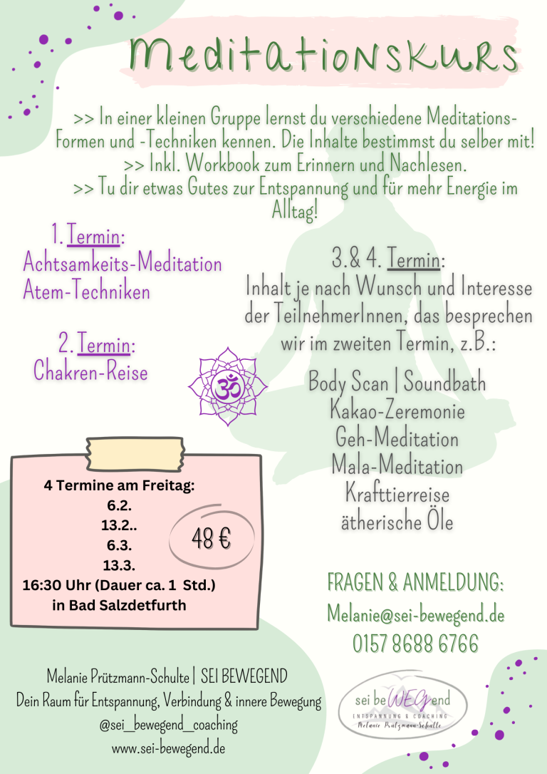 -> In einer kleinen Gruppe lernst du verschiedene Meditationsformen und -Techniken kennen. Die Inhalte bestimmst du selbst mit!